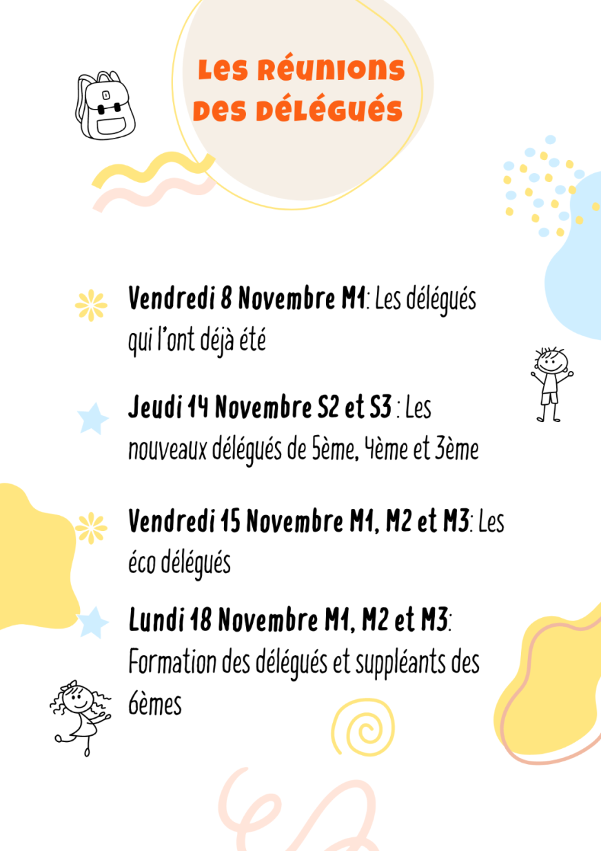 - Jeudi 14 novembre en S2 et S3, une formation pour les nouveaux délégués de 5e,4e et 3e (référentes : Florence G et Léa L)