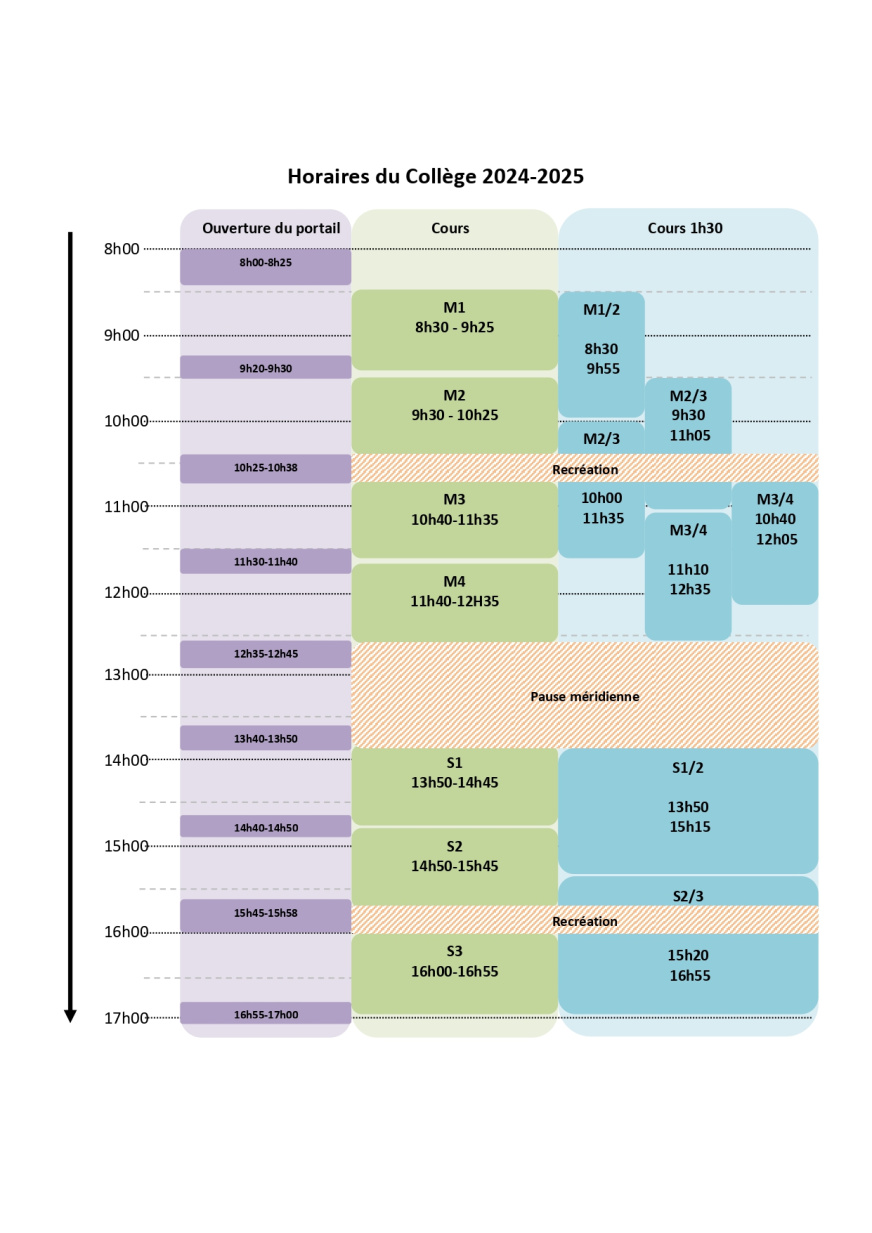 Les cours ont lieu de 8h30 à 16h55, le mercredi de 8h30 à 12h35. Les portes du Collège sont ouvertes à 8h00.