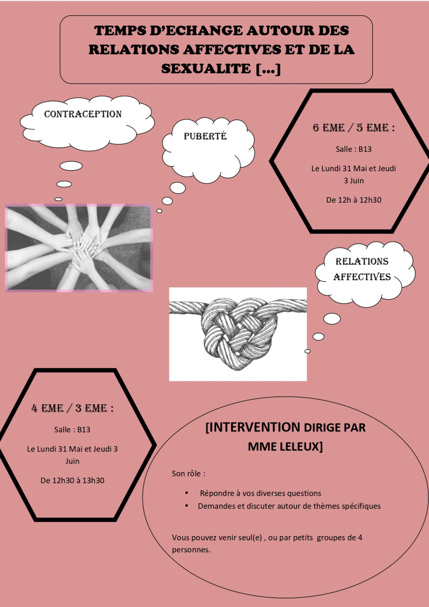 Mme Leleux, du centre de planification et d’éducation familiale de Vitré, sera présente au collège le midi. Elle assurera un atelier d’échanges libres auprès des élèves volontaires. Ainsi, les élèves pourront, seuls ou en petits groupes poser leurs questions et discuter autour des thèmes suivants : relations affectives, sexualité, puberté et contraception. Ces temps d’échanges sont prévus le lundi 31 mai et le jeudi 3 juin en salle B13 sur le temps du midi.