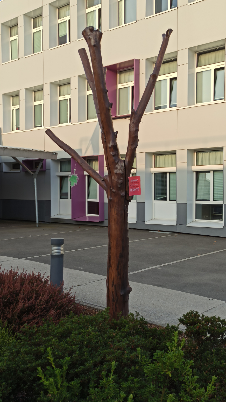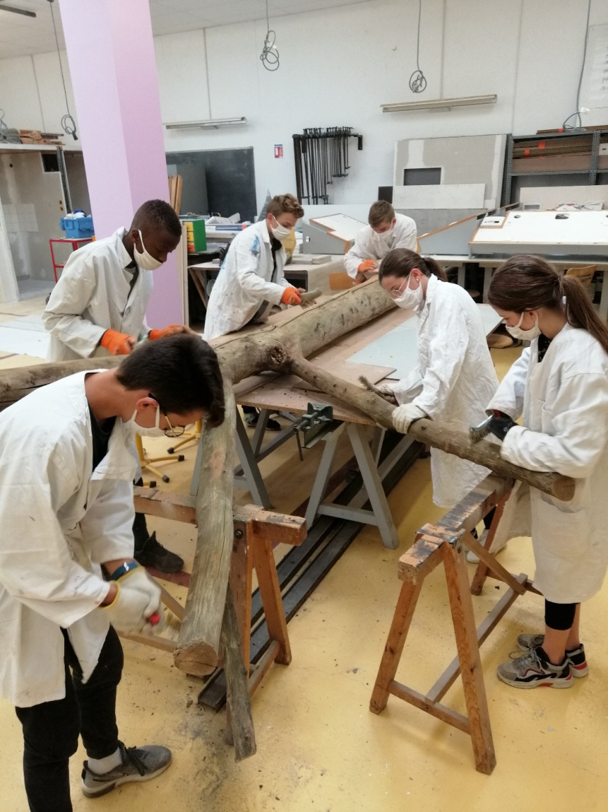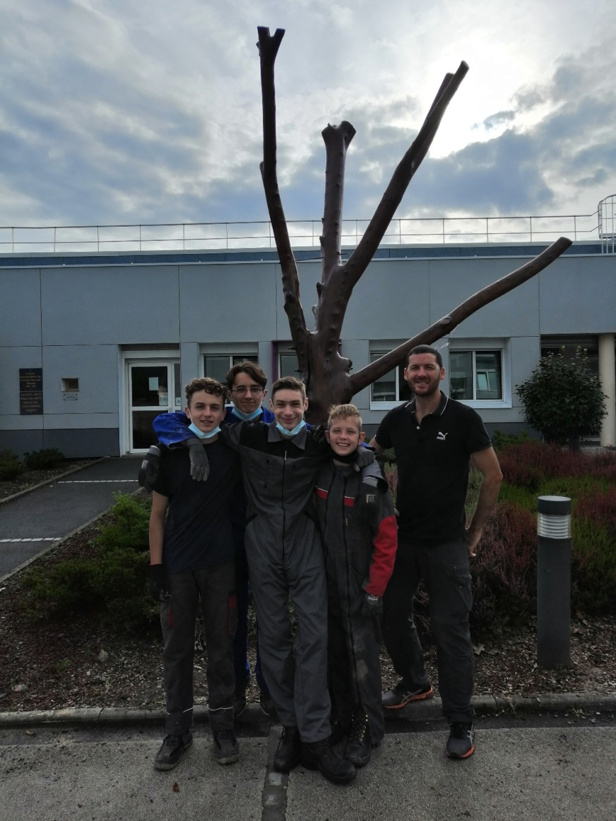 Ce travail a commencé dès la 4e pour les élèves. L’arbre, que M Thébert a récupéré chez un paysan, a du être poncé, vernis deux fois et enfin solidifié avec des tiges filetées pour consolider certaines branches plus fragiles.