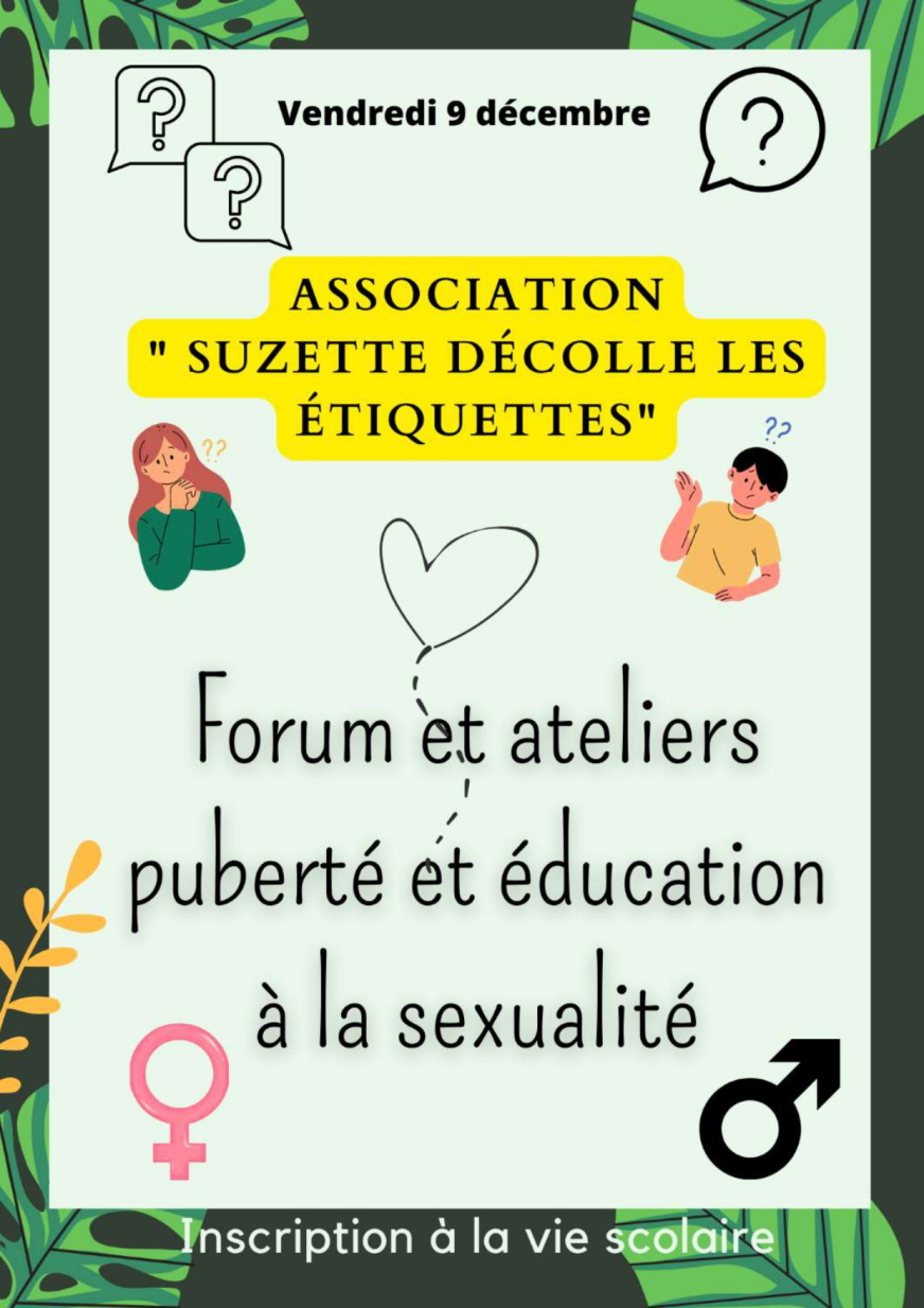 Le vendredi 9 décembre de 12h00 à 13h30, le collège en partenariat avec le conseil départemental organise un forum autour de la puberté et l’éducation à la sexualité.